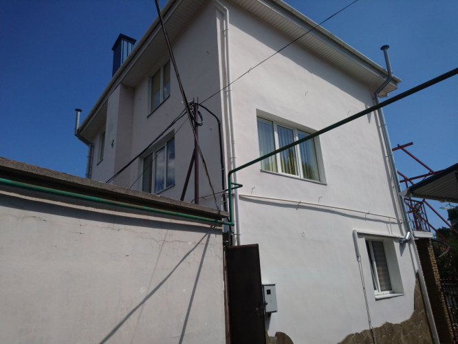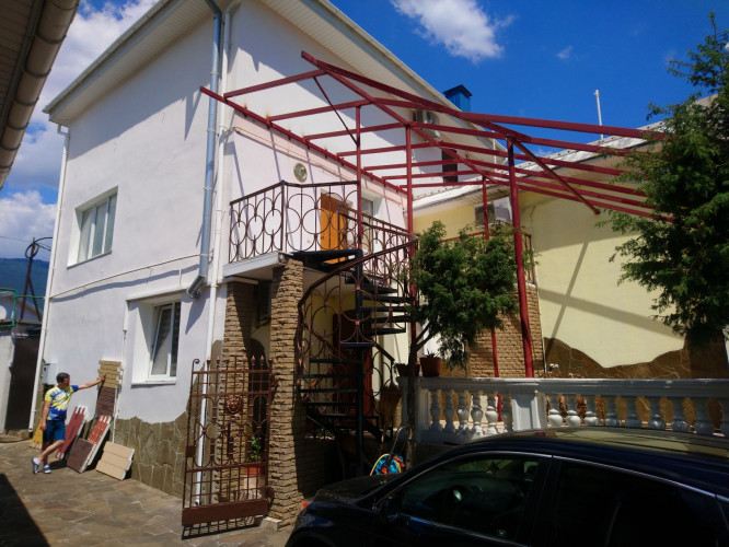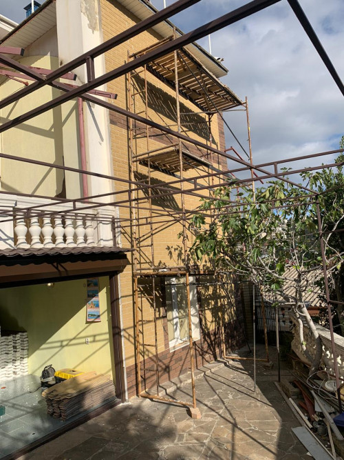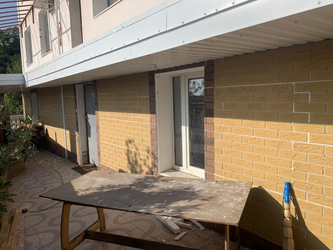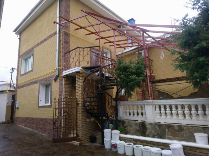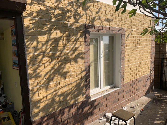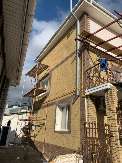 При выполнении работ по облицовке дома в г. Ялта были использованы тёплые панели и сайдинг с фактурой под Клинкер «Леонардо А» с рондолями и углы «Сарматия»